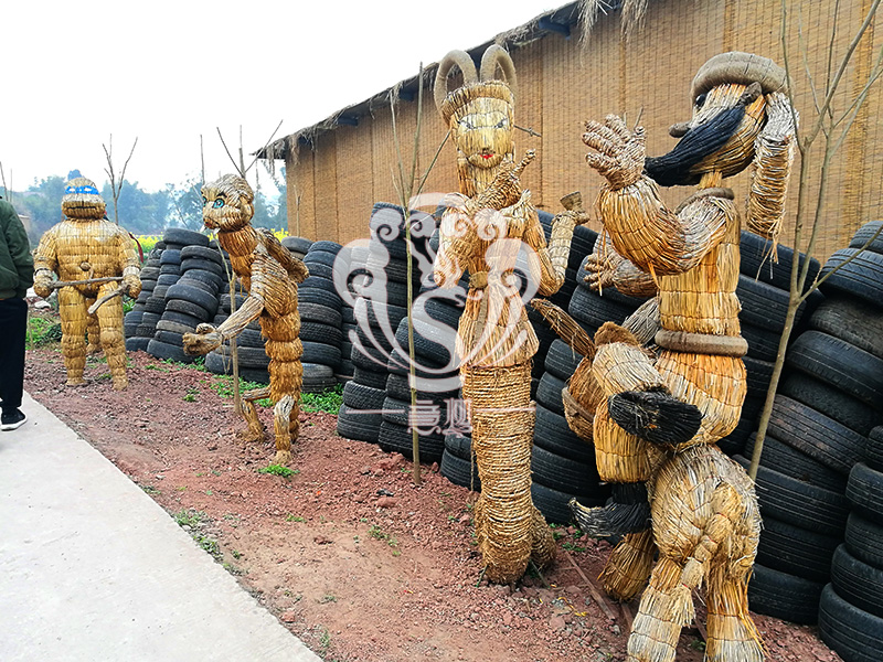 現(xiàn)在的精致稻草人藝術(shù)通常是由專業(yè)美術(shù)老師的造型放樣,然后由焊工師傅焊接出立體造型造型,然后以稻草或者稻草繩為材料編捆制作而成。
