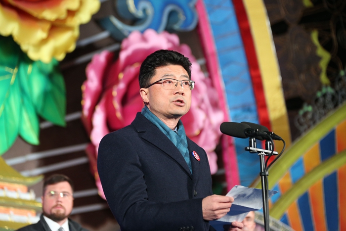 市委書記李剛在開幕式上發表了熱情洋溢的致辭。他說,燈會已成為我們這座城市最靚麗的名片。今年的燈會,還有一個鮮明的特色,就是全球聯動。今晚,自貢燈會將在北京、上海、天津、重慶、深圳、成都、西安、武漢、昆明、宜賓、廣元11座城市同時點亮;而美國、英國、法國、新加坡、比利時等國家,也正舉辦著一場場熱鬧喜慶的自貢燈會。自貢向全國、全世界人民送上了真誠祝福。燈會搭建起開放合作的交流平臺,讓新老朋友走進自貢、關注自貢、了解自貢。李剛書記熱情歡迎海內外朋友共同分享自貢發展機遇,攜手共創更加美好未來。